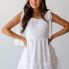 All great love stories are bound to start with the All About Love White Eyelet Tiered Mini Dress! This dress is a perfect blend of romantic detailing and modern flair, making it a versatile addition to your wardrobe for any special occasion or casual outing. Crafted from delicate eyelet fabric, this mini dress offers a light and airy feel, ensuring comfort and breathability throughout the day. The pristine white hue adds a fresh and radiant touch, evoking a sense of purity and innocence. Pair it with strappy sandals and delicate jewelry for a romantic daytime look, or dress it up with heels and statement accessories for an evening affair! Lightweight Cotton Fabrication Eyelet Square Neckline Functional Tie Straps Flowy Tiered Fit Side Zipper Short/Mini Length Fully Lined Self + Contrast: 100% Cotton Lining: 65% Polyester, 35% Cotton Hand Wash Cold, Line Dry Model is 5’4″ and wearing a Small.Garment Measurements in Inches:Small | Bust 32″ | Waist 26″ | Hips 50″ | Length 31″Medium | Bust 34″ | Waist 28″ | Hips 52″ | Length 32″Large | Bust 36″ | Waist 30″ | Hips 54″ | Length 33″