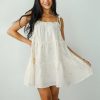 Watch yourself (and everyone else) fall for every detail of the Adored Outing Cream Floral Linen Tiered Mini Dress! Crafted from airy, breathable linen, it features delicate embroidered flowers that add a touch of whimsy and feminine detail. The tiered silhouette creates a playful, flowy shape, perfect for warm, sunny days. Adjustable tie straps offer a customizable fit with a sweet, dainty finish. Whether you’re heading to a picnic, brunch, or a weekend getaway, this dress pairs beautifully with sandals or espadrilles for a light, breezy look that’s both romantic and carefree! Lightweight Crinkle Linen Fabrication Embroidered Flowers Elastic Ruffled Square Neckline Functional Tie Straps Flowy Tiered Fit Short/Mini Length Fully Lined Self: 100% Cotton Lining: 65% Cotton, 35% Rayon Hand Wash Cold, Hang or Line Dry Model is 5’4″ and wearing a Small.Garment Measurements in Inches:Small | Bust 28” (Stretches up to 34″) | Waist 40” | Hips 56” | Length 31”Medium | Bust 30” (Stretches up to 36″) | Waist 42” | Hips 58” | Length 32”Large | Bust 32” (Stretches up to 38″) | Waist 44” | Hips 60” | Length 33″