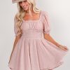 It’d be impossible to deny you some loving attention when you’re wearing the Gentle With Your Heart Mauve Romper! Designed in a soft mauve hue, this romper features romantic puff sleeves with elastic cuffs, a flattering cinched waist, and flowy shorts for an effortlessly feminine silhouette. The lightweight fabric keeps it breezy and comfortable, while the square neckline adds a touch of modern elegance. Pair it with strappy sandals for daytime outings or dress it up with heels for a night out! Lightweight Woven Knit Fabrication Elastic Square Neckline Short Puff Sleeves with Elastic Cuffs Smocked Elastic Waistband Relaxed Fit Lined Body, Unlined Sleeves Self: 53% Tencel, 27% Nylon, 16% Polyester, 4% Spandex Lining: 100% Polyester Hand Wash Cold, Lay Flat to Dry Models are 5’0″ + 5’4″ and are wearing a Small.Garment Measurements in Inches:Small | Bust 28” | Waist 26” (Stretches up to 30″) | Hips 44” | Length 30” | Inseam 2″Medium | Bust 30” | Waist 28” (Stretches up to 32″) | Hips 46” | Length 31” | Inseam 2″Large | Bust 32” | Waist 30” (Stretches up to 34″) | Hips 48” | Length 32” | Inseam 2.5″