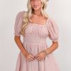 It’d be impossible to deny you some loving attention when you’re wearing the Gentle With Your Heart Mauve Romper! Designed in a soft mauve hue, this romper features romantic puff sleeves with elastic cuffs, a flattering cinched waist, and flowy shorts for an effortlessly feminine silhouette. The lightweight fabric keeps it breezy and comfortable, while the square neckline adds a touch of modern elegance. Pair it with strappy sandals for daytime outings or dress it up with heels for a night out! Lightweight Woven Knit Fabrication Elastic Square Neckline Short Puff Sleeves with Elastic Cuffs Smocked Elastic Waistband Relaxed Fit Lined Body, Unlined Sleeves Self: 53% Tencel, 27% Nylon, 16% Polyester, 4% Spandex Lining: 100% Polyester Hand Wash Cold, Lay Flat to Dry Models are 5’0″ + 5’4″ and are wearing a Small.Garment Measurements in Inches:Small | Bust 28” | Waist 26” (Stretches up to 30″) | Hips 44” | Length 30” | Inseam 2″Medium | Bust 30” | Waist 28” (Stretches up to 32″) | Hips 46” | Length 31” | Inseam 2″Large | Bust 32” | Waist 30” (Stretches up to 34″) | Hips 48” | Length 32” | Inseam 2.5″