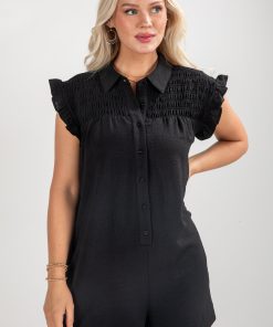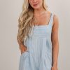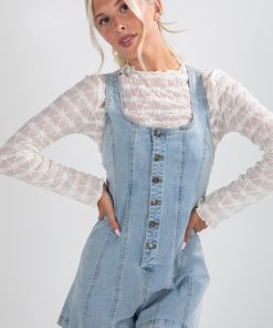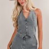 Summer styling is just better with pieces like the Simple Wishes Denim Halter Romper! This flirty one-piece features soft, lightweight denim with a flattering halter neckline. The cinched waist creates a feminine silhouette, while the relaxed shorts keep it breezy and comfortable for all-day wear. Perfect for sunny days, weekend outings, or casual date nights, this romper brings effortless style with a touch of retro flair. Just add sandals and sunnies for the ultimate warm-weather look! Stretchy Lightweight Denim Fabrication Halter V-Neckline Sleeveless Functional Button Front Functional Button + Hidden Zipper Fly Closure Relaxed Fit Side Pockets 65% Cotton, 33% Polyester, 2% Spandex Hand Wash Cold, Hang or Line Dry Models are 5’4″ and are wearing a Small.Garment Measurements in Inches:Small | Bust 30” | Waist 24” | Hips 36” | Length 32” | Inseam 2″Medium | Bust 32” | Waist 26” | Hips 38” | Length 33” | Inseam 2″Large | Bust 34” | Waist 28” | Hips 40” | Length 33” | Inseam 2″